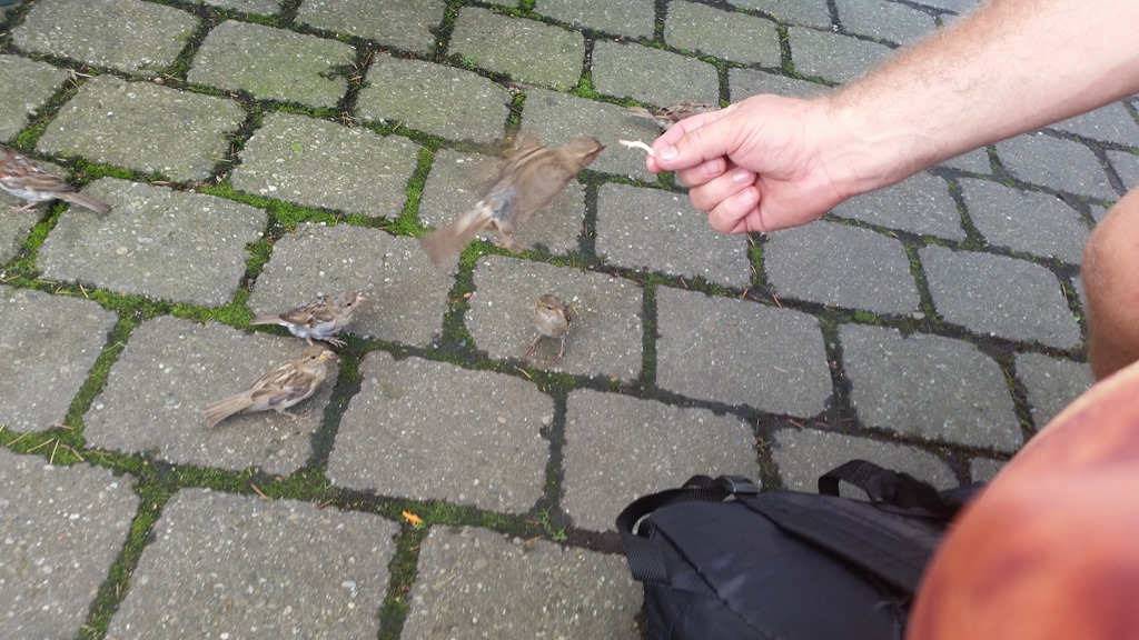 Dr Doolittle feeding the sparrows by hand