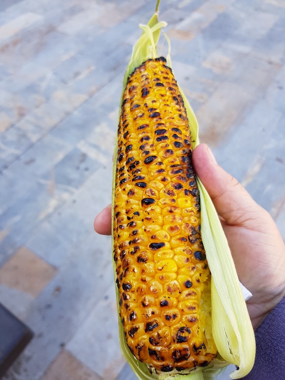 sweetcorn stripped of leaves and thrown directly on the coals creating a charred, blackened sweetness slathered with butter and salt (my lunch) (although I had to order 2 because “someone” who shall remain nameless, their “bite” turned into snorting up half!!) and massive potatoes baked in foil in a wood fired oven stuffed with all manner of fresh grated veggies, a little cheese and patatas bravas sauce creating a vegetarian (!!) explosion of flavours for the gorgeous Mr T, Irene & Tony.